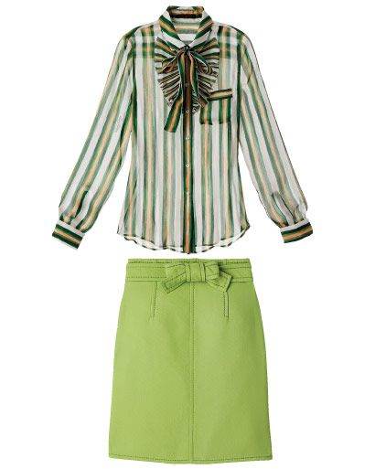 La Colección de Versace, con su aeromoza en un minivestidos verde, con el detalle del cierre con botones delanteros, y los bolsos de formas angulosas, ha inspirado a otros diseñadores a seguir esta tendencia.