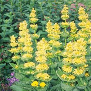 Características: Planta perenne de la familia de las gencianáceas de hasta 120 cm de altura. Tallos erectos, que nacen de una raíz muy vigorosa de hasta 30 cm de longitud, blanca por dentro y marronácea al exterior. Hojas inferiores mucho más largas que las superiores, de color verde-amarillo y con los nervios muy destacados. Hojas superiores sin peciolo, opuestas y puntiagudas. Flores amarillas reunidas en verticilos. Frutos en cápsula, que encierra muchas semillas.